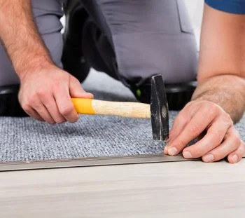 Person using a hammer to install flooring.