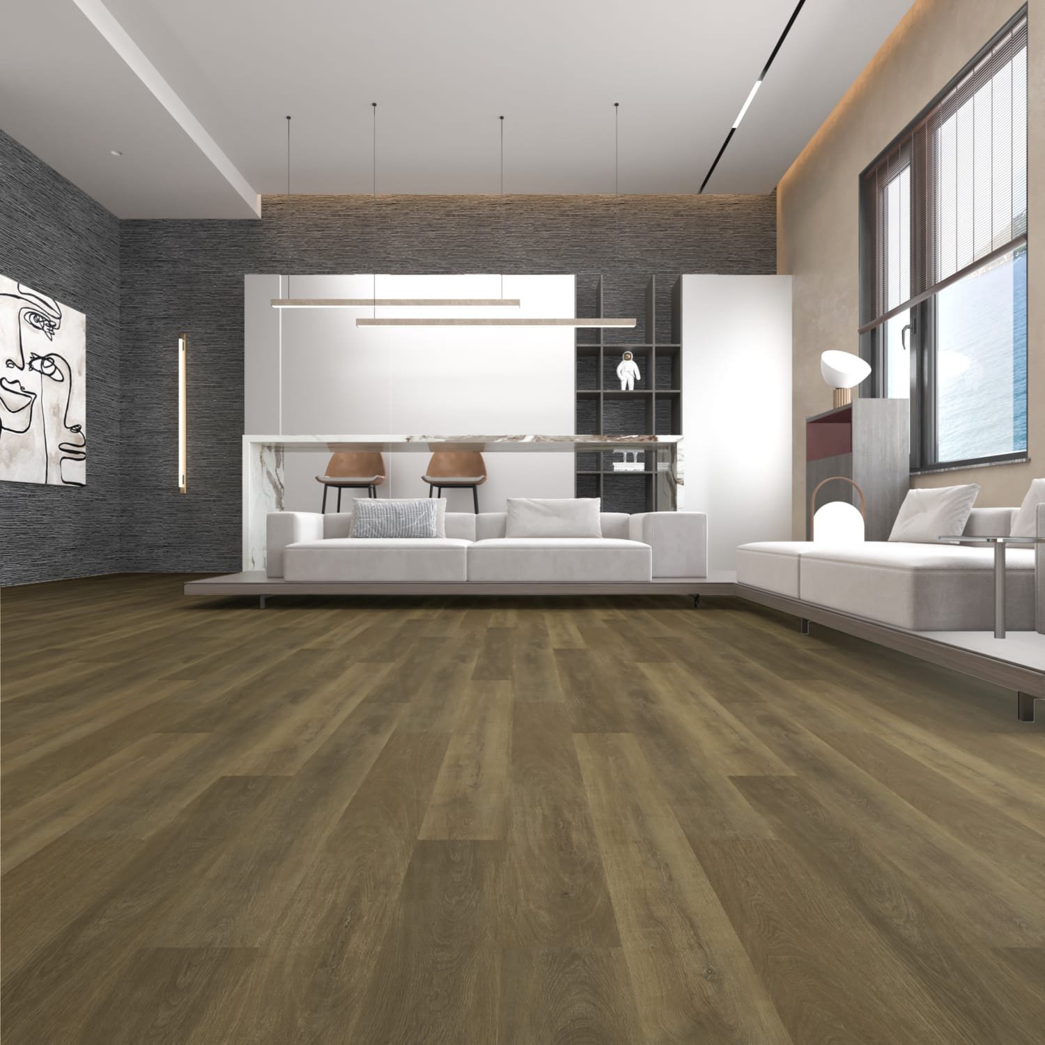 Modern living room with white sofas, wooden flooring, black textured accent wall, abstract art, large window, and decorative lighting.