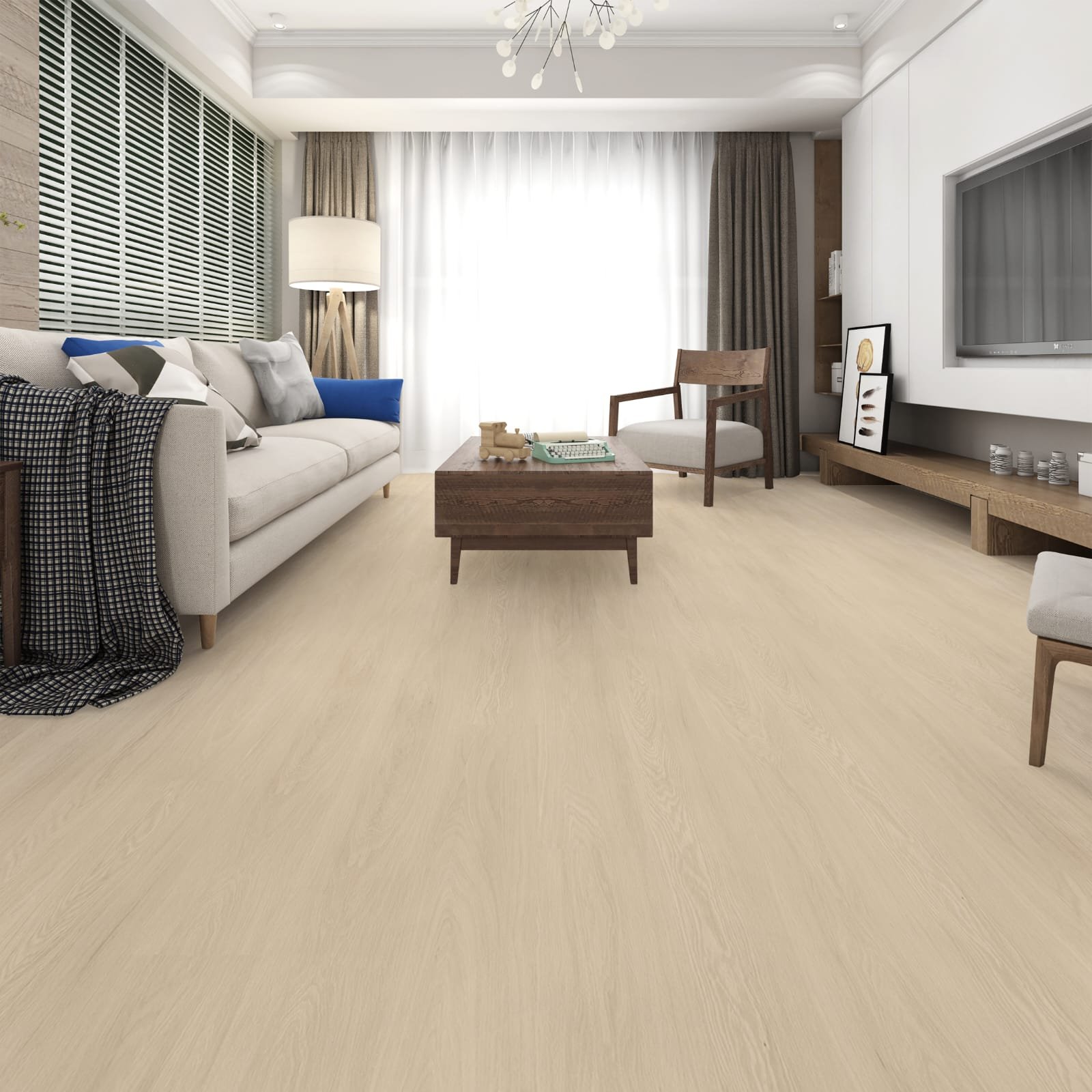 Modern living room with beige sofa, wooden coffee table, armchair, and wall-mounted flat-screen TV. Bright, airy space with natural light, neutral tones, and minimalist decor.